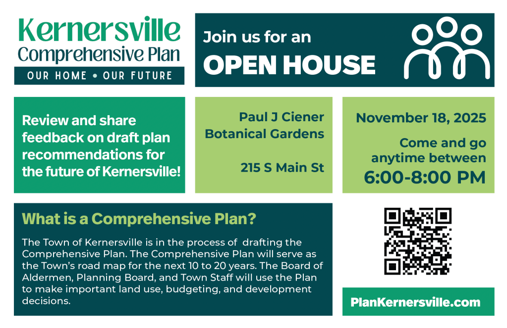 Greetings, Kernersville! Please mark your calendars for Tuesday, November 18th for the second community open house for The Town’s Comprehensive Plan. Stop by the Ciener Botanical Gardens between 6 and 8pm to join us and talk turkey, draft plan recommendations, and the future of Kernersville.